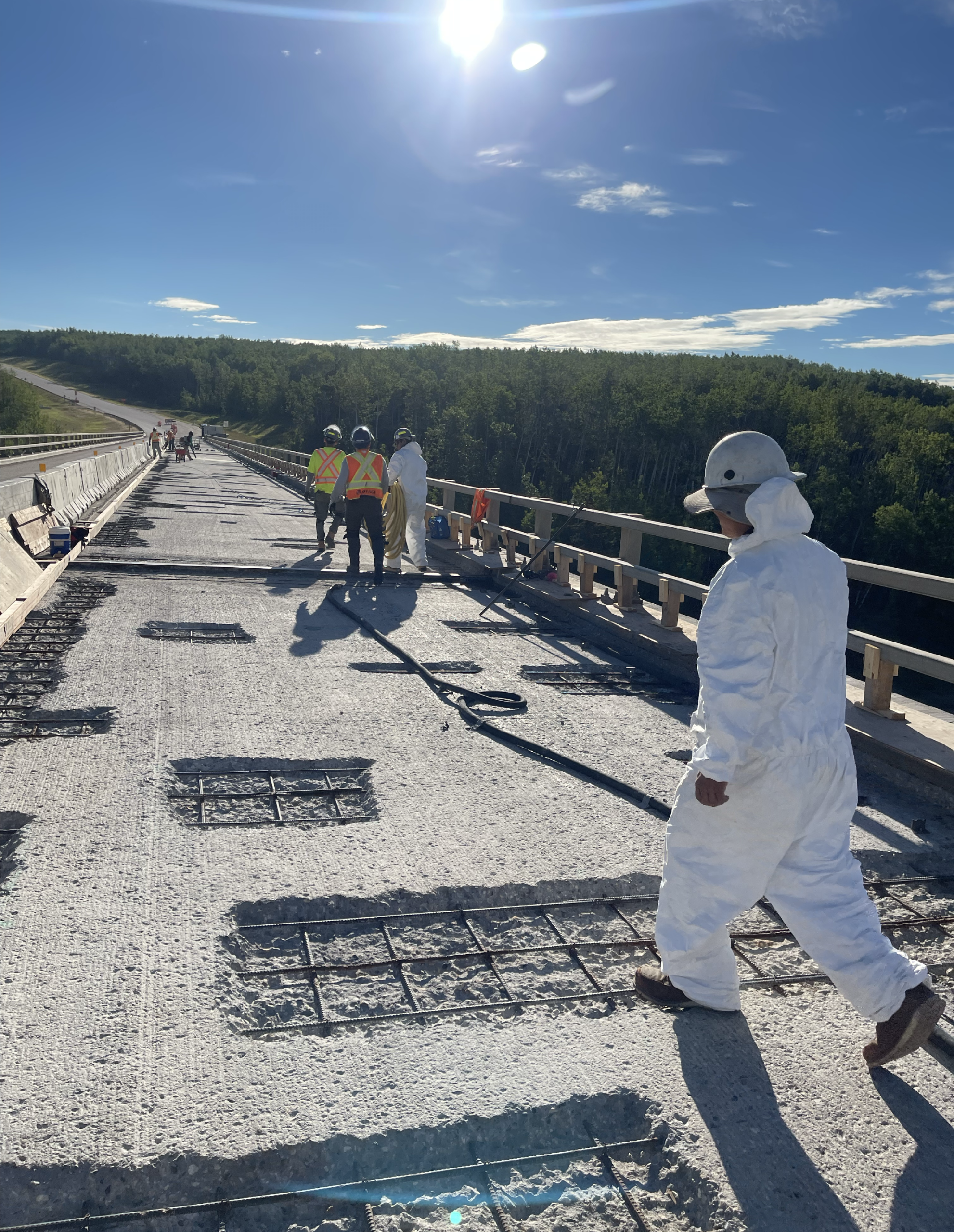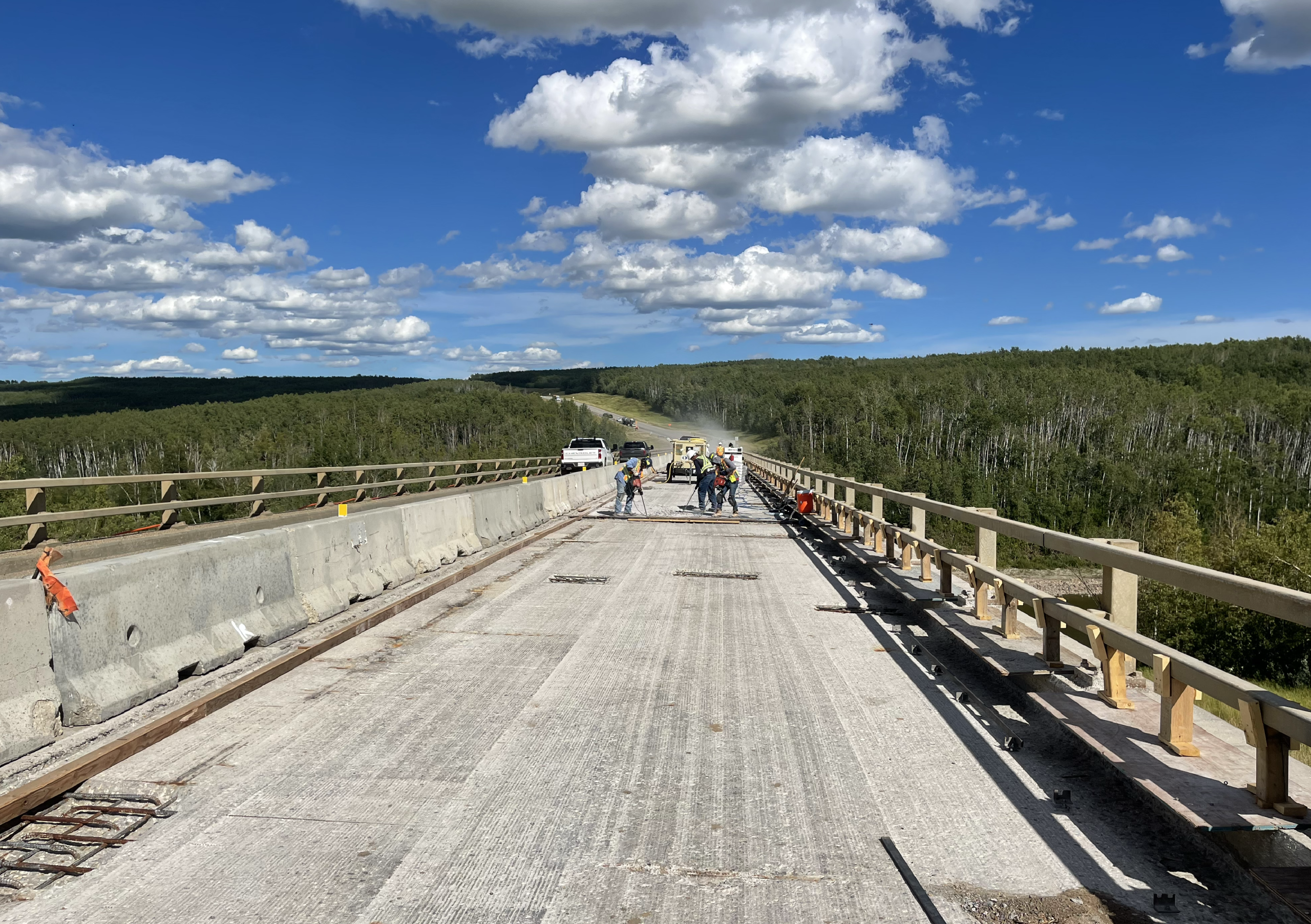 For the Little Smoky Bridge on Highway 49, we provided the full workforce for all concrete deck repairs on the 271 m long structure. Our scope included jackhammering and removing deteriorated concrete, exposing and preparing reinforcing steel, and placing new concrete across the repair areas. The deck surface was then completed with a consistent tie-in finish to ensure a uniform, durable riding surface.